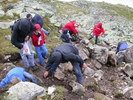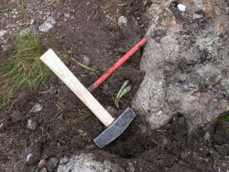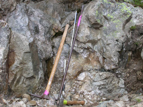 Ausgerüstet mit Hammer und Meissel und Strahlerstock begeben sie sich auf eine Wanderung zu den Fundstellen und Klüften.
