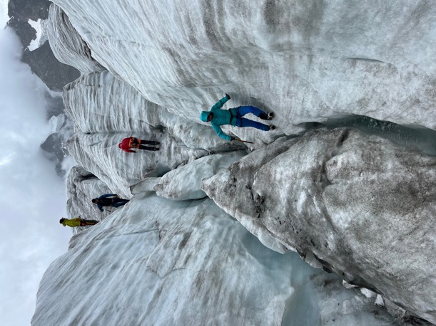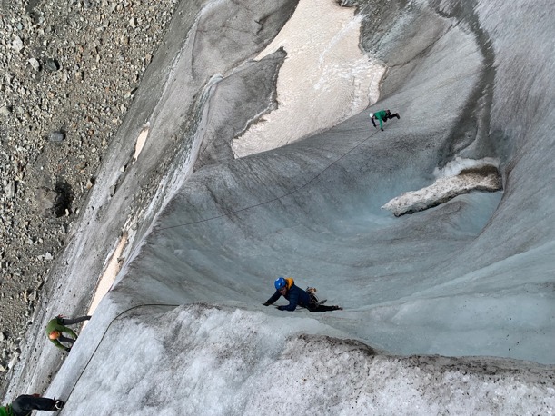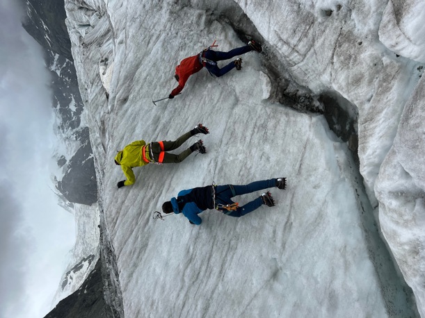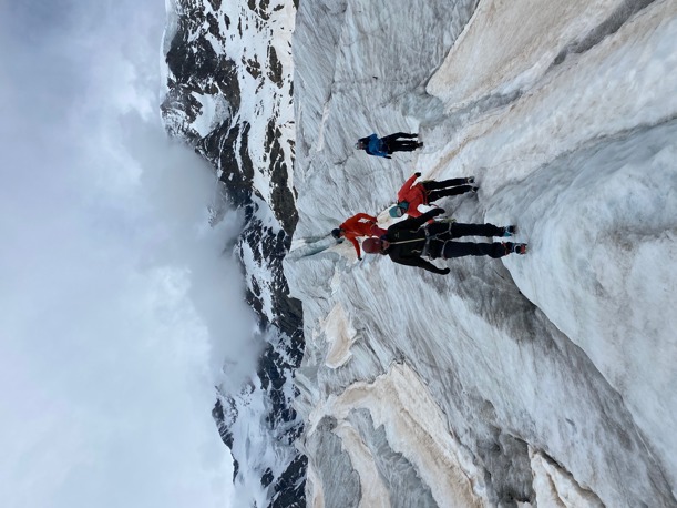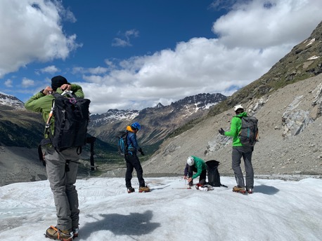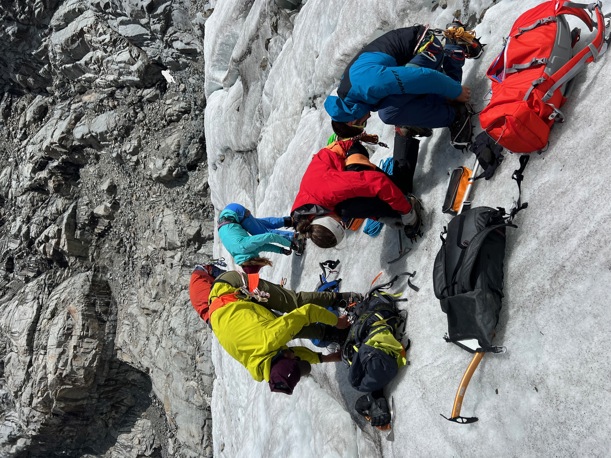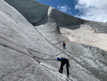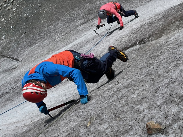 Du machst dich mit der Gletscherausrüstung vertraut, lernst Steigeisentechniken und Pickeltechniken und weisst wie man sich auf Firnfelder oder auf Gletscher Verhalten soll.