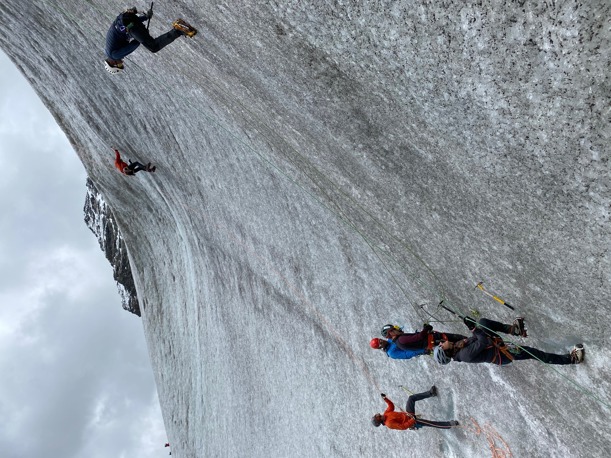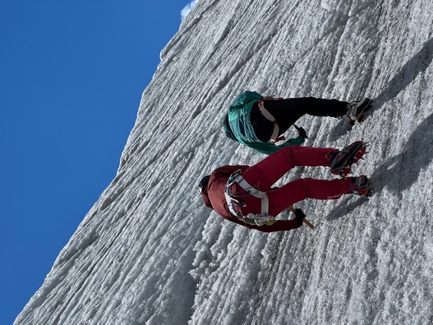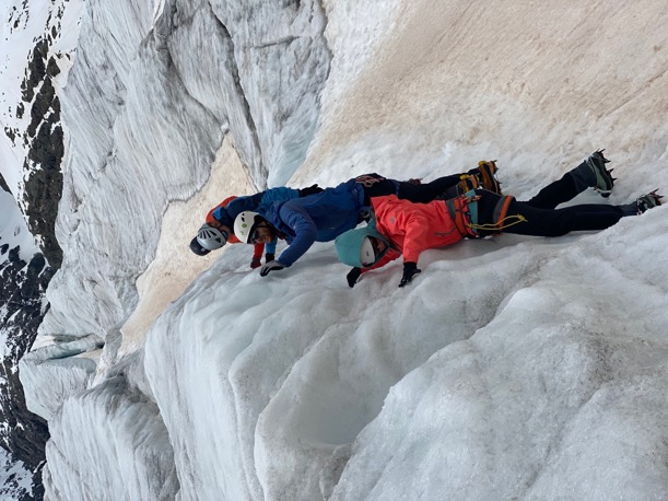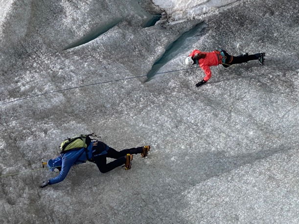 Am ersten Tag erlernst Du den richtigen Einsatz Deiner Steigeisen und die verschiedenen Pickeltechniken. Auf dem Gletscher und im Firn, durch Spalten und in Flanken kannst Du Dich austoben und Dein Können erwerben und festigen. Verankerungen mit Eisschrauben sowie das Verhalten in einer Seilschaft auf Firnfeldern und Gletschern.