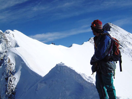Vom richtigen Gehen im weglosem Gelände, Seil- und Sicherungstechniken, Klettertechnik im Fels und Eis. Mit Steigeisen im Firn und über Gräte sicher zu gehen.