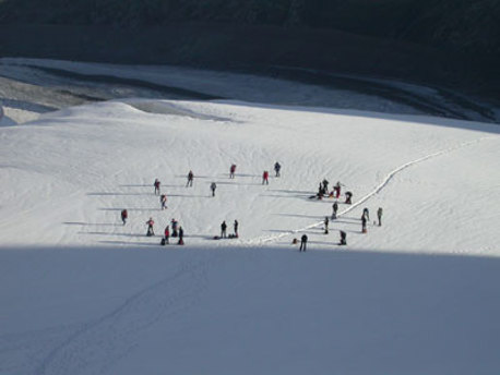 Mittwoch: Eisausbildung auf dem Morteratschgletscher: Gehen mit Steigeisen, Umgang mit Pickel, Eisklettern und Gehen am Seil, Verankerungen und Spaltenrettung