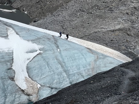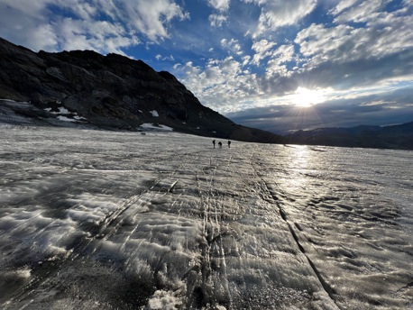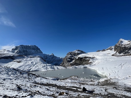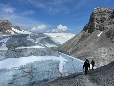 Die saftigen, grünen Wiesen lassen wir bald unter uns und wandern stetig höher bis zum legendären Iswändli. Ganz früher eine richtige Eiswand, ist diese heute nur noch ein geneigter Hang und mit Steigeisen leicht zu begehen. Bald erblicken wir den Gipfel des Clariden. Doch vorher überschreiten wir noch den Vorgipfel und kraxeln über den kurzen Felsgrat, der mit Ketten ausgerüstet ist, zum höchsten Punkt. Bei guter Fernsicht können Sie einige Viertausender der Berner und Walliser Alpen sehen. Nach einer zünftigen Gipfelrast, steigen wir auf Firn und Schnee zum Claridengletscher ab. Auf diesem und über den vergletscherten Claridenpass erreichen wir bald die, von mächtigen Gletschern umgebene, Planurahütte. Eine wahrlich schmucke Oase in dieser Hochgebirgswelt.