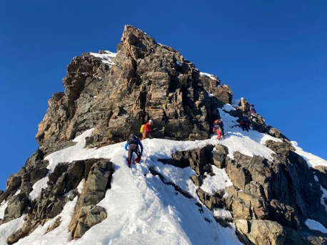 Um 3 Uhr gibt es Frühstück. Danach starten wir im Dunkeln mit der Stirnlampe und gelangen über den schmalen und ausgesetzten Weg zum Tschierva Gletscher. Ab nun sind wir den ganzen Tag am Seil. Hoch über eine steile Finflanke oder den Klettersteig bis in die Fuorcla Prievlus. Auf der Fuorcal dürfen wir einen tollen Sonnenaufgang bewundern. Vor dem Biancograt gilt es erst in leichter Kletterei vorwärts zu kommen. Über den Biancograt steigen wir in etwa 2 Stunden hoch bis zum Piz Bianco. Nun erwartet uns die 2. Etappe der Kletterei bis hin zum Piz Bernina mit seinen 4049 Meter. Der Abstieg erfolgt über den Normalweg, den Spallagrat bis zur Marco e Rosa Hütte.