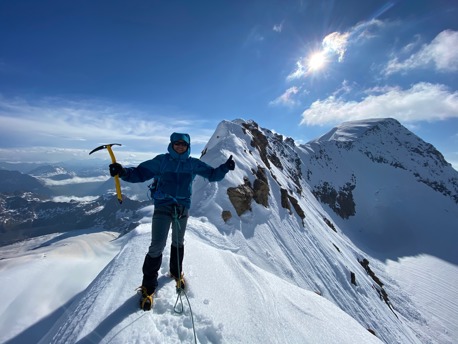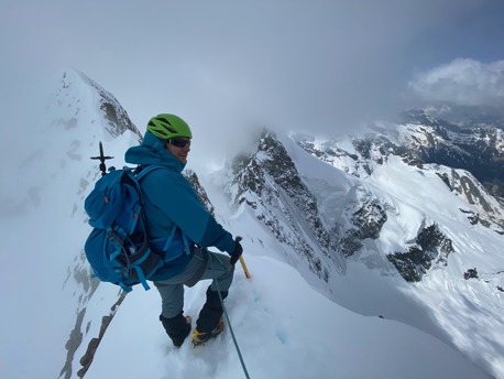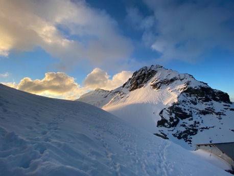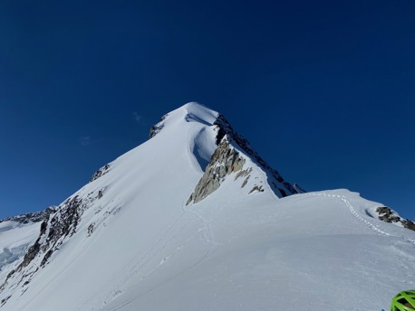 Gleich hinter der Hütte beginnt dann der Pfad in Richtung Fuorcla Prievlusa und somit zum Einstieg des Biancogrates. Am Anfang im Firn und kurz vor dem Ziel im Fels erreichen wir den Gipfel. Auf der Südseite der Piz Bernina befindet sich die Marco e Rosa Hütte, wo wir die zweite Nacht übernachten.