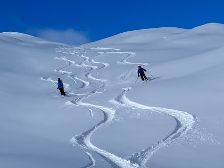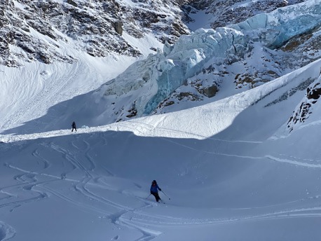 Am letzten Tag geht es ab Val Roseg zum Piz San Gian (1200hm, 4h). Eine unglaublich schöne und lange Abfahrt führt uns direkt nach St. Moritz Bad.