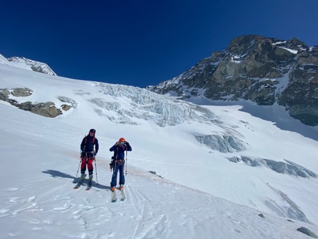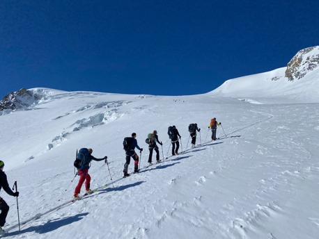 Am zweiten Tag wagen steigen wir zum Piz Palü. Das Gipfel-Highlight dieser Ski-Durchquerung. Wir fahren frühmorgens auf den Persgletscher ab, wo wir auffellen und uns für den Aufstieg vorbereiten. Gemächlich suchen wir uns den Weg durch die Cambrenabrüche mit seinen eindrücklichen Gletscherspalten. Auf 3730 m deponieren wir unsere Skis und erklimmen mit Steigeisen und Pickel noch die letzten Meter hoch bis zum Ostgipfel des Piz Palü. Bei guten Verhälnissen gehen wir auch noch weiter auf den Hauptgipfel. Vom Skidepot fahren wir über Pers- und Morteratschgletscher ab zur Bovalhütte.