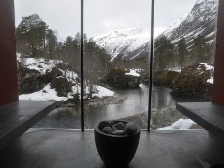 Bei Knut im Juvet Landscape Hotel sind wir bestens aufgehoben. In seinem "Projekt", wie er es nennt, erfährt man architektonischen Minimalismus und Panoramafenster mit unbeschreiblicher Aussicht auf die Natur. Die Bewirtung ist geradzu ein Lekerbissen.